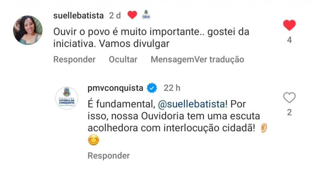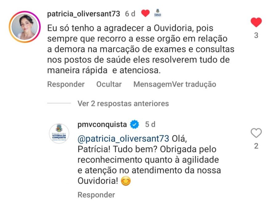 E foi o que fez a usuária Suelle Batista que comentou: “Ouvir o povo é muito importante. Gostei da iniciativa. Vamos divulgar”. A usuária dos serviços de Saúde, Patrícia Oliveira, também deu o seu depoimento nas nossas redes. “Eu só tenho a agradecer a Ouvidoria, pois sempre que recorro a esse órgão em relação à demora na marcação de exames e consultas, eles resolveram tudo de maneira rápida e atenciosa”, disse.