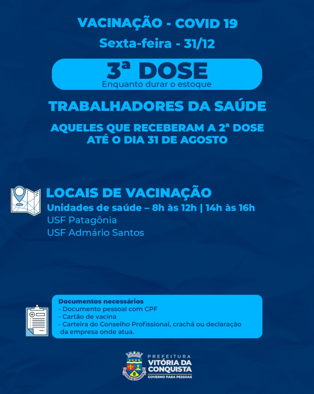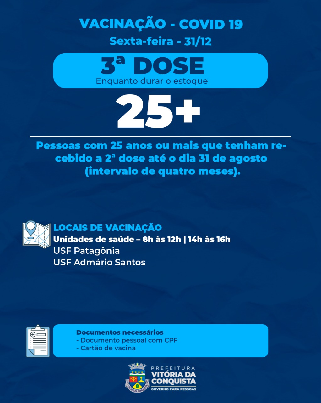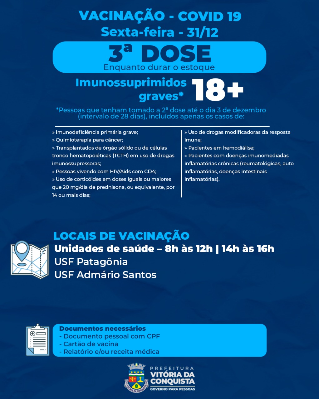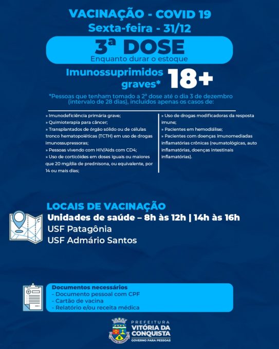 Nesta sexta, a 3ª dose só estará disponível nas unidades de saúde Patagônia e Admário Santos (bairro Brasil). Poderão tomar o reforço, trabalhadores da saúde e as pessoas de 25 anos ou mais que tomaram a 2ª dose até o dia 31 de agosto (intervalo de quatro meses), além dos imunossuprimidos graves que completaram o esquema vacinal com as duas doses até o dia 3 de dezembro (intervalo de 28 dias).