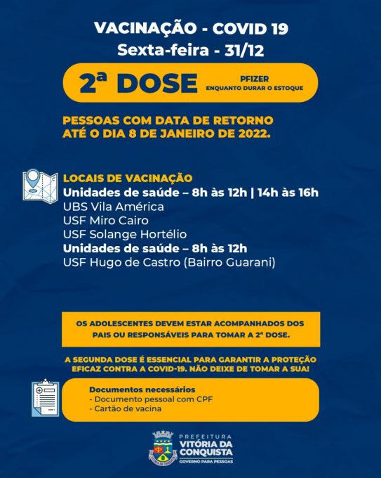 Para aqueles que precisam se vacinar com a 2ª dose da Pfizer até o dia 8 de janeiro, poderão antecipar a vacinação nas unidades de saúde Miro Cairo, Vila América e Solange Hortélio (Urbis II); e apenas no turno da manhã na unidade Hugo de Castro (Bairro Guarani).
