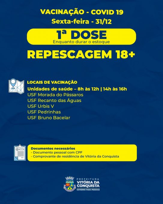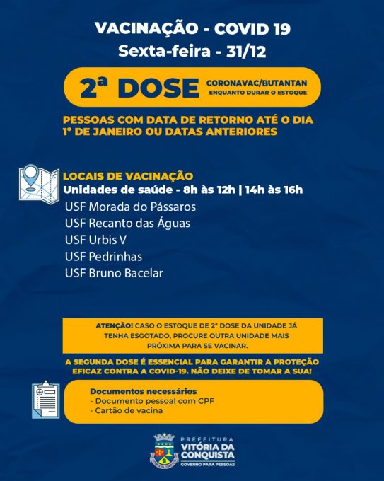 As pessoas maiores de 18 anos que ainda não se vacinaram com a 1ª dose e aquelas que estão com 2ª dose da Coronavac/Butantan agendada para o dia 1º de janeiro ou em atraso, poderão se dirigir às unidades de saúde da família Morada do Pássaros, Recanto das Águas, Urbis V, Pedrinhas e Bruno Bacelar.