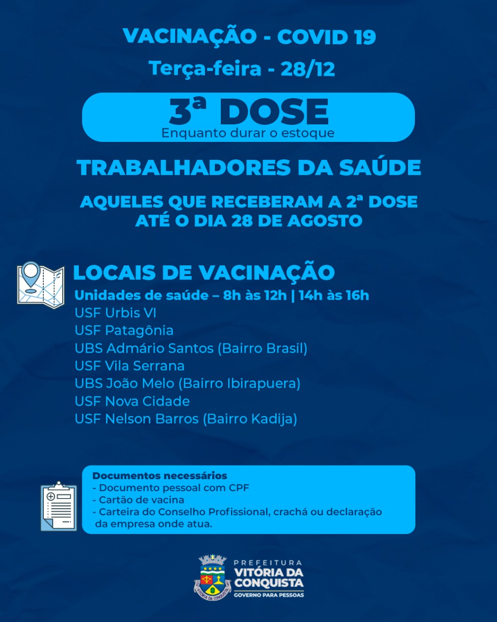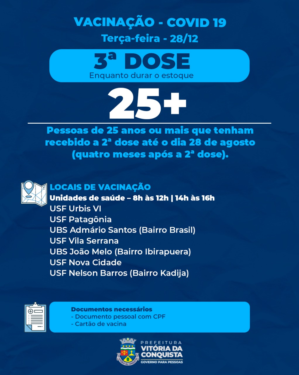A vacinação contra a Covid-19 continua nesta terça-feira (27), com 1ª, 2ª e 3ª doses, nos shoppings Conquista Sul e Boulevard, das 14h às 18h, e em 22 unidades de saúde, de 8h às 12h e de 14h às 16h, ou enquanto durarem os estoques. Confira os públicos abaixo.