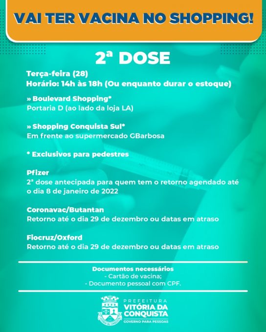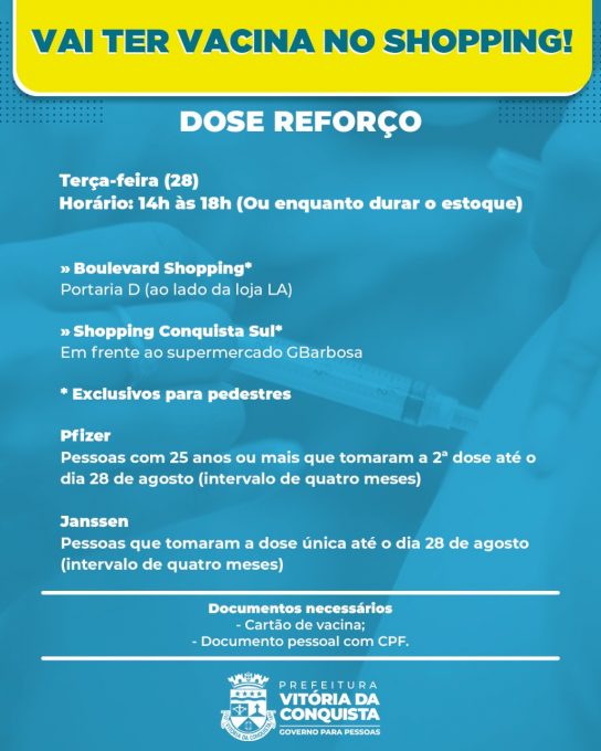 A vacinação será no Boulevard Shopping na Portaria D, ao lado da loja LA, e no Shopping Conquista Sul, o ponto de vacinação estará em frente ao supermercado G. Barbosa.