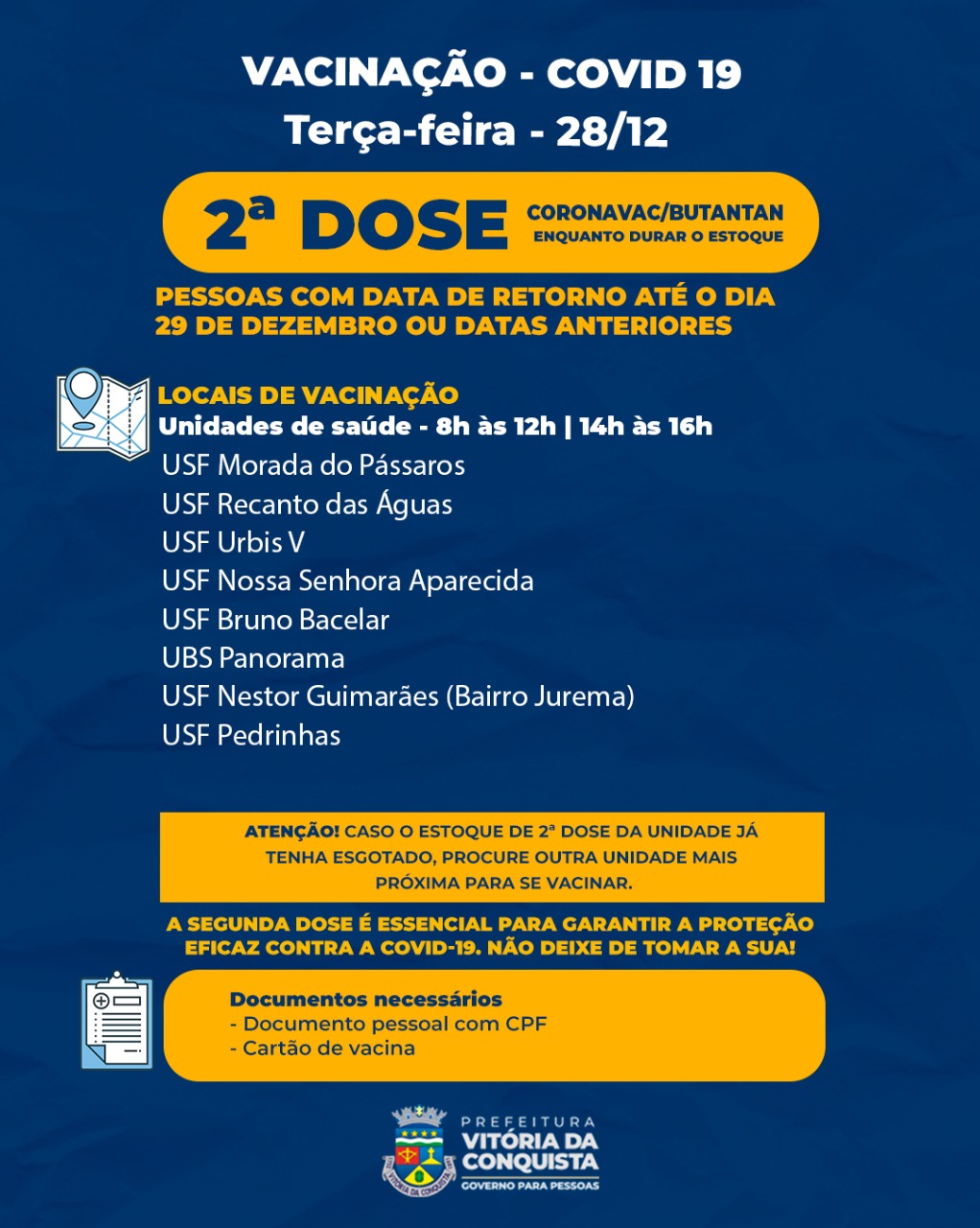 A 1ª dose ainda estará disponível para as pessoas maiores de 18 anos que ainda não se vacinaram nas unidades de saúde do Bruno Bacelar, Panorama, Nestor Guimarães (Bairro Jurema), Pedrinhas, Morada do Pássaros, Nossa Senhora Aparecida, Recanto das Águas e Urbis V. Nessas mesmas unidades também haverá vacinação com a 2ª dose da Coronavac/Butantan para as pessoas que estão o retorno para o dia 29 de dezembro ou em atraso.