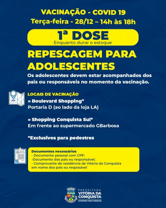 Haverá repescagem com a 1ª dose para adolescentes que ainda não foram vacinados, que deverão estar acompanhados dos pais ou responsável no momento da vacinação. Também terá vacinação para quem precisa tomar a 2ª dose ou a dose de reforço, que passa a valer com a redução do intervalo para quatro meses da 2ª dose.