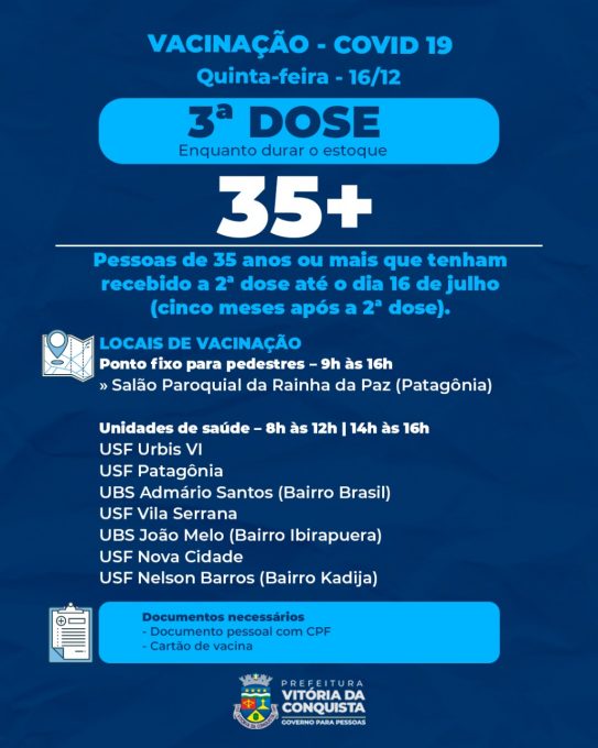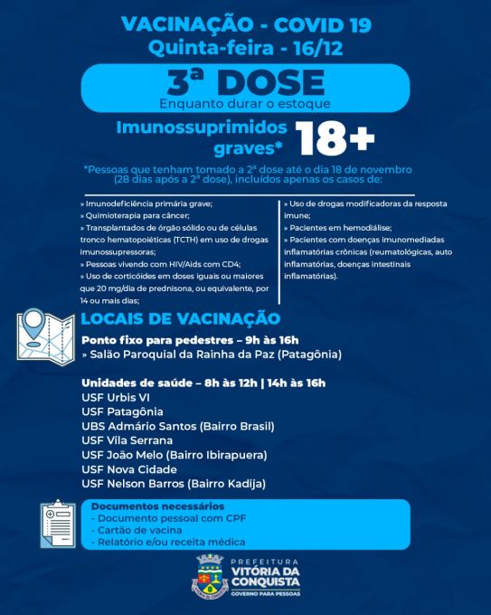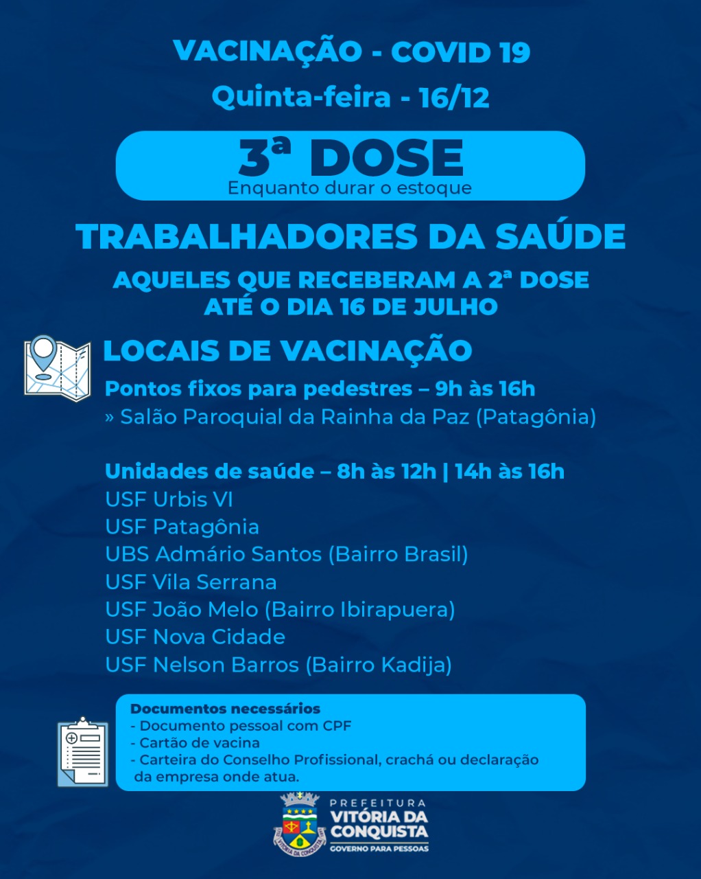 Para os trabalhadores da saúde e as pessoas de 35 anos ou mais que tomaram a 2ª dose até o dia 16 de julho, há cinco meses, ou imunossuprimidos graves que tomaram a 2ª dose até o dia 18 de novembro, a dose de reforço estará disponível de 9h às 16h no Salão Paroquial da Rainha da Paz (Patagônia), e de 8h às 12h e de 14h às 16h, nas unidades de saúde do Urbis VI, Patagônia, Admário Santos (bairro Brasil), Vila Serrana, João Melo (bairro Ibirapuera), Nova Cidade e Nelson Barros (bairro Kadija).