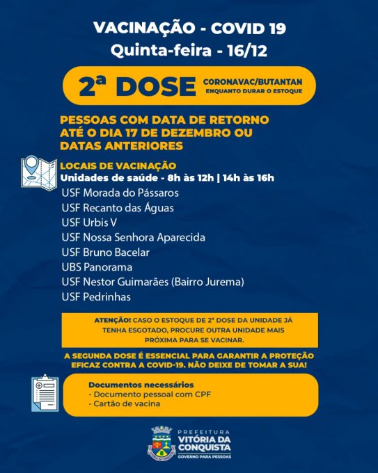 Para quem precisa tomar a 2ª dose da Coronavac/Butantan, que está em atraso ou tem retorno agendado para o dia 17 de dezembro, a vacinação estará acontecendo nas mesmas unidades que estão aplicando a 1ª dose.
