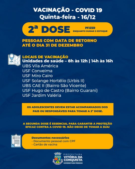 Já para as pessoas que precisam tomar a 2ª dose da Pfizer até o dia 31 de dezembro, já pode procurar uma das unidades de saúde para se vacinar. As unidades são: Vila América, Conveima, Miro Cairo, Solange Hortélio (bairro Urbis II), CAE II (bairro São Vicente), Hugo de Castro (bairro Guarani) e Jardim Valéria.