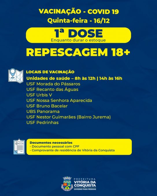 A repescagem continua para as pessoas de 18 anos ou mais que ainda não se vacinaram nas unidades de saúde do Morada dos Pássaros, Recanto das Águas, Urbis V, Nossa Senhora Aparecida, Bruno Bacelar, Panorama, Nestor Guimarães (bairro Jurema) e Pedrinhas. Para se vacinar, basta apresentar documento pessoal com foto e comprovante de residência.