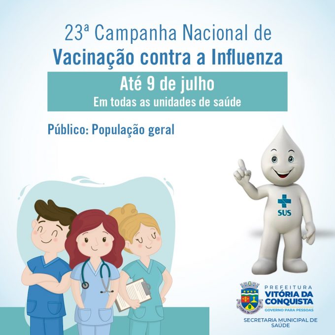 A vacina contra a Influenza já está disponível para toda a população conquistense nas 42 unidades de saúde da zona urbana e rural, de 7h às 17h. A campanha foi iniciada no dia 12 de abril com a meta de imunizar 114.645 pessoas dos grupos prioritários. Até o momento, 59.651 delas já foram vacinadas contra a Influenza, representando uma cobertura de 50.2% dos grupos prioritários, com uma média acima da cobertura vacinal do estado da Bahia.