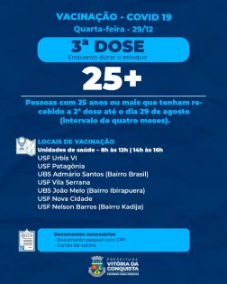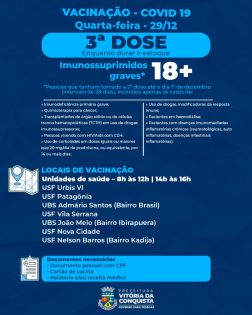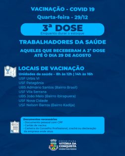 A 3ª dose será para os trabalhadores da saúde e as pessoas de 25 anos ou mais que tomaram a 2ª dose até o dia 29 de agosto (intervalo de quatro meses), e os imunossuprimidos graves que completaram o esquema vacinal com as duas doses até o dia 1º de dezembro (intervalo de 28 dias). A vacinação será nas unidades de saúde Urbis VI, Patagônia, João Melo (Bairro Ibirapuera), Nova Cidade, Nelson Barros (Bairro Kadija), Admário Santos (Bairro Brasil) e Vila Serrana.