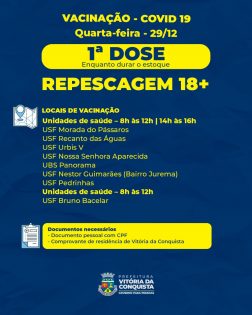 Para quem tem mais de 18 anos e ainda não se vacinou, a repescagem está ocorrendo nas unidades de saúde do Panorama, Nestor Guimarães (Bairro Jurema), Pedrinhas, Morada do Pássaros, Nossa Senhora Aparecida, Recanto das Águas e Urbis V. Apenas na unidade de saúde do Bruno Bacelar a vacinação acontecerá somente no turno da manhã e suspensa no turno da tarde por conta de uma atividade interna da equipe.