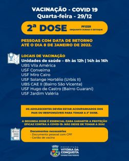 Já a 2ª dose da Pfizer está sendo ofertada nas unidades para as pessoas que precisam completar o esquema vacinal até o dia 8 de janeiro de 2022. As unidades de saúde são: Conveima, Solange Hortélio (Urbis II), Miro Cairo, Hugo de Castro (Bairro Guarani), Jardim Valéria, CAE II (Bairro São Vicente) e Vila América.
