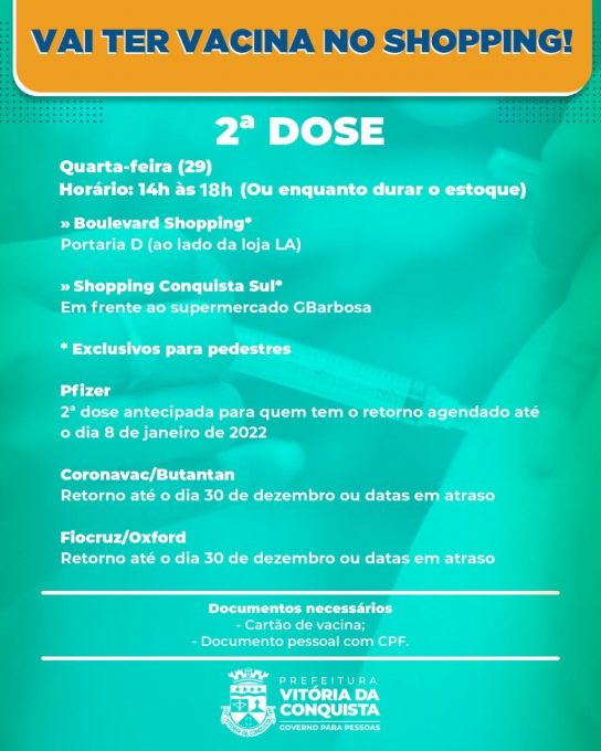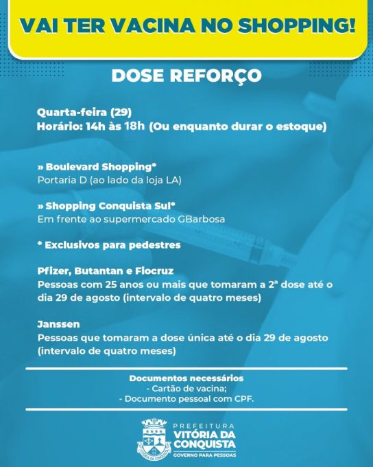 Quem precisa se vacinar com 1ª, 2ª ou 3ª dose poderá procurar um dos 24 locais de vacinação nesta quarta-feira (29). A vacinação ocorrerá nos nos shoppings Conquista Sul e Boulevard, das 14h às 18h, e em 22 unidades de saúde, de 8h às 12h e de 14h às 16h, ou enquanto durarem os estoques.