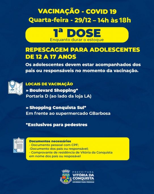 Terá repescagem de 1ª dose para os adolescentes que ainda não se vacinaram, que deverão estar acompanhados dos pais ou responsável no momento da vacinação.