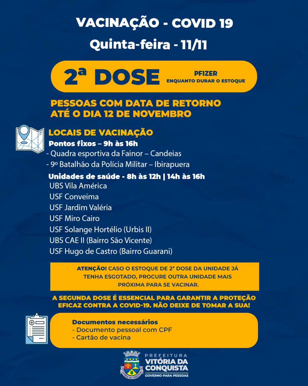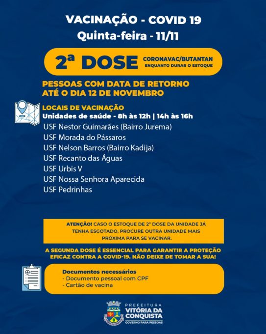 A 2ª dose da Coronavac também estará disponível em algumas unidades de saúde, no mesmo horário, para aqueles que estão com retorno agendado até o dia 12 de novembro.