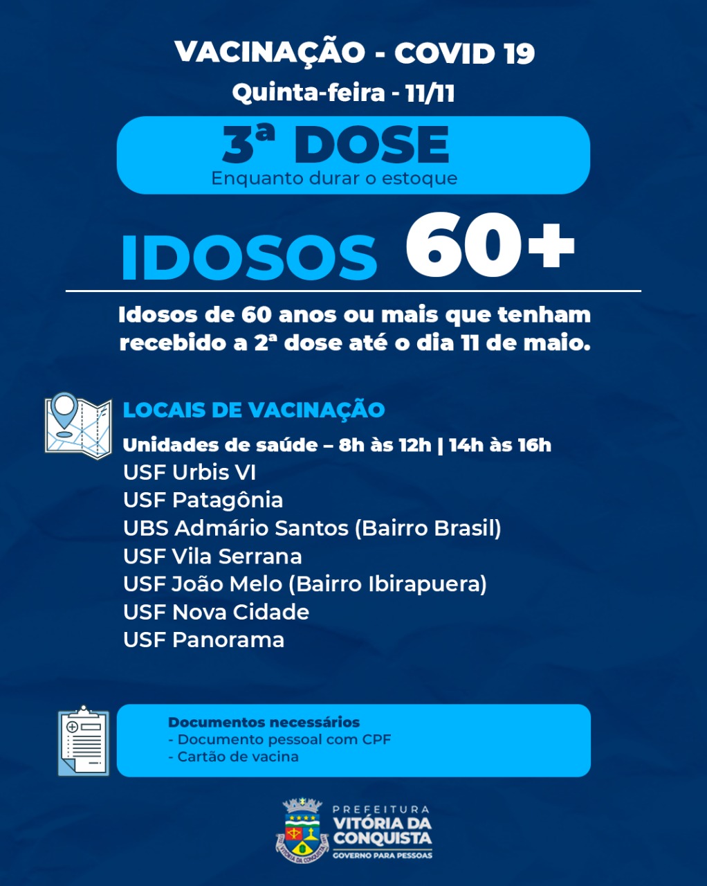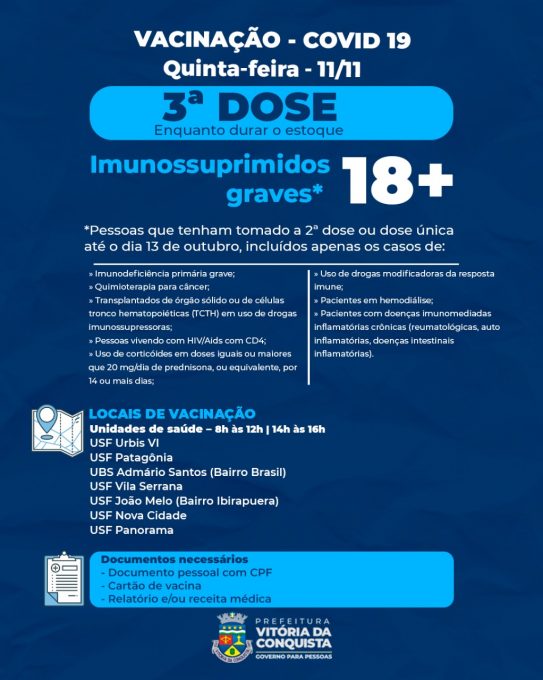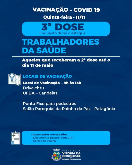 TERCEIRA DOSE – Nesta quinta-feira (11), a 3ª dose será para os trabalhadores da saúde e idosos de 60 anos ou mais que tenham tomado a 2ª dose até o dia 11 de maio, além de pessoas com doenças de imunossupressão grave que tenham tomado a 2ª dose até o dia 13 de outubro.