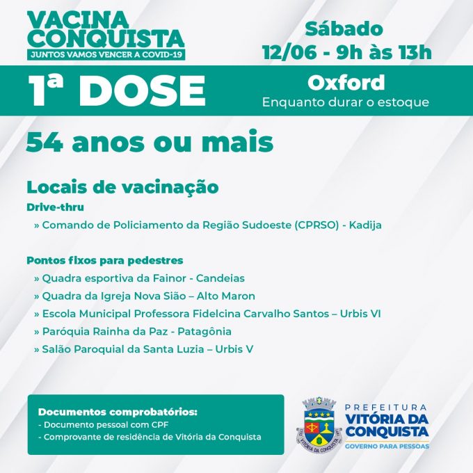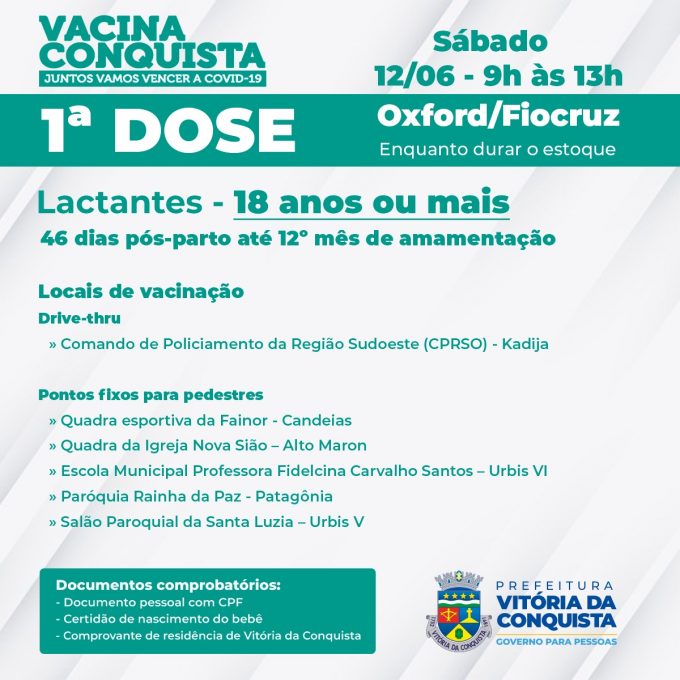 Documentos – Para todos os públicos incluídos na vacinação, é necessário apresentar, obrigatoriamente, documento pessoal com CPF e comprovante de residência de Vitória da Conquista. Para comprovação, os trabalhadores da educação devem apresentar também o contracheque do mês de maio de 2021. As lactantes devem levar a certidão de nascimento do bebê.