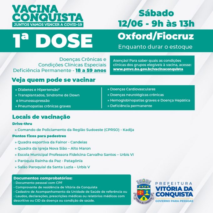 Também prossegue a vacinação de trabalhadores da Educação que tenham 30 anos ou mais. As pessoas de 18 a 59 anos que pertençam a um dos grupos prioritários de portadores de doenças crônicas e condições especiais, que ainda não se vacinaram, devem observar as condições clínicas dos grupos elegíveis à vacina, conforme informações disponíveis no site, em www.pmvc.ba.gov.br/vacinaconquista.