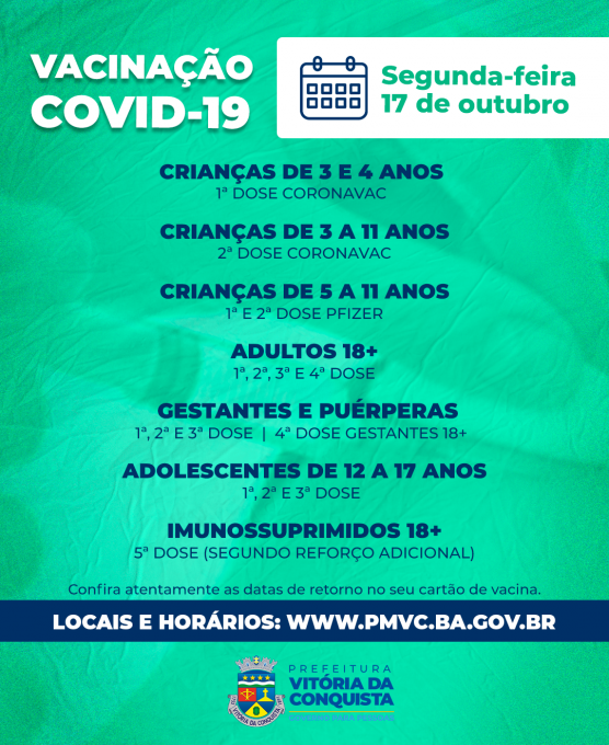Documentação: Para a 1ª dose, é preciso apresentar o documento de identificação pessoal com CPF dos responsáveis e da criança (CPF ou cartão SUS); cartão de vacina; comprovante de residência de Vitória da Conquista. Caso a criança esteja acompanhada por outro responsável maior de 18 anos, os pais devem encaminhar autorização para vacinação por escrito.