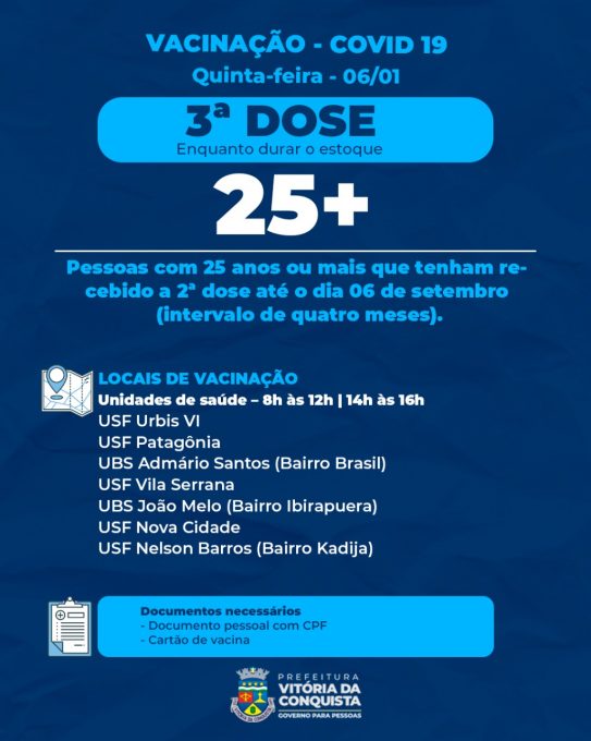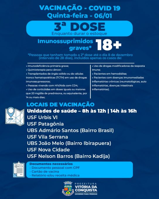 Já a 3ª dose estará disponível para os trabalhadores da saúde e as pessoas de 25 anos ou mais que tomaram a 2ª dose até o dia 6 de setembro (intervalo de quatro meses), além dos imunossuprimidos graves que tomaram a 2ª dose até o dia 8 de dezembro (intervalo de 28 dias). A vacinação ocorrerá nas unidades de saúde Urbis VI, Patagônia, Admário Santos (Bairro Brasil), Vila Serrana, João Melo (Bairro Ibirapuera), Nova Cidade e Nelson Barros (Bairro Kadija).