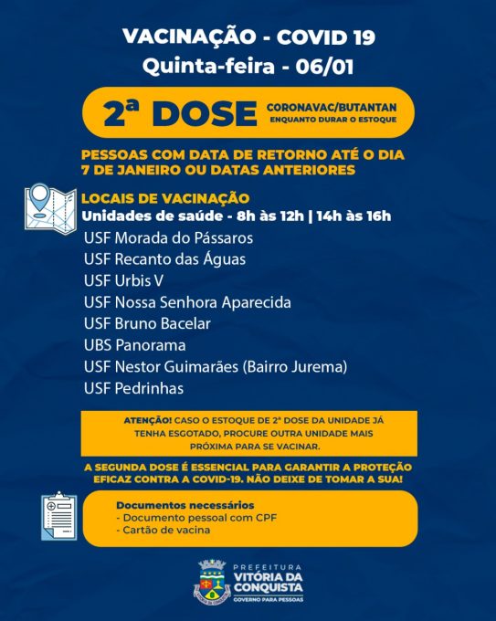 A 1ª dose ou a 2ª dose da Coronavac/Butantan, agendada para o dia 7 de janeiro ou em atraso, estará disponível nas unidades de saúde Morada do Pássaros, Recanto das Águas, Urbis V, Nossa Senhora Aparecida, Bruno Bacelar, Panorama, Nestor Guimarães (Bairro Jurema) e Pedrinhas.