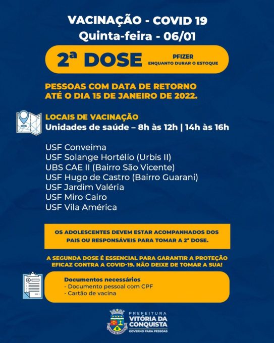 Para aqueles que precisam tomar a 2ª dose da Pfizer até o dia 15 de janeiro já pode antecipar a vacinação nas unidades de saúde do Conveima, Solange Hortélio (Urbis II), CAE II (Bairro São Vicente), Hugo de Castro (Bairro Guarani), Jardim Valéria, Miro Cairo ou Vila América.