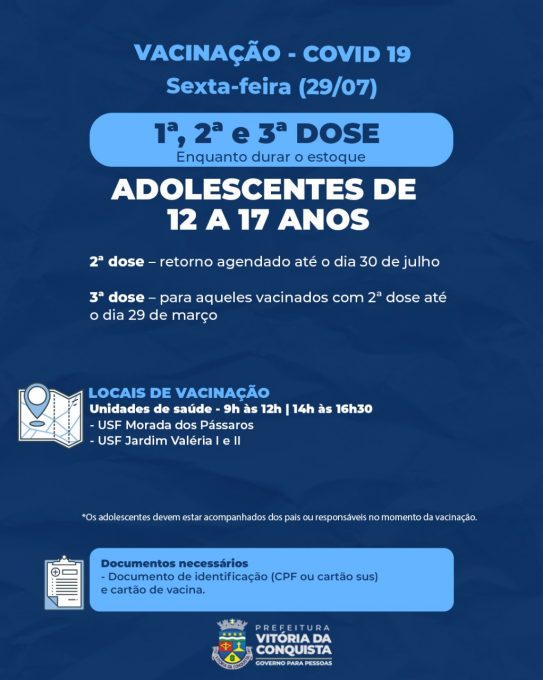 Adolescentes, gestantes e puérperas – Para esses grupos, terá a 1ª, 2ª e 3ª doses nas unidades de saúde Morada dos Pássaros e Jardim Valéria I e II, nos dois turnos. Os adolescentes devem estar acompanhados dos pais ou responsáveis no momento da vacinação.