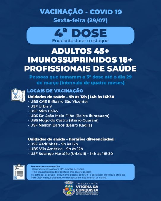 Adultos –A 4ª dose para os adultos de 45 anos ou mais, imunossuprimidos maiores de 18 anos e trabalhadores da saúde, será nas unidades de saúde CAE II (bairro São Vicente), Urbis V, Miro Cairo, Dr. João Melo Filho (bairro Ibirapuera), Hugo de Castro (Guarani) e Nelson Barros (Kadija). As unidades de saúde do Pedrinhas e Vila América fazem a vacinação pela manhã e na Solange Hortélio (Urbis II), à tarde.