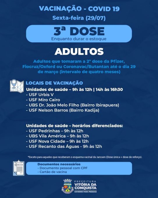 Já os adultos que precisam tomar a 3ª dose devem se dirigir às unidades Urbis V, Miro Cairo, Dr. João Melo Filho (bairro Ibirapuera) e Nelson Barros (bairro Kadija), que atendem nos dois turnos, ou as unidades Pedrinhas, Vila América, Nova Cidade e Recanto das Águas, somente pela manhã.