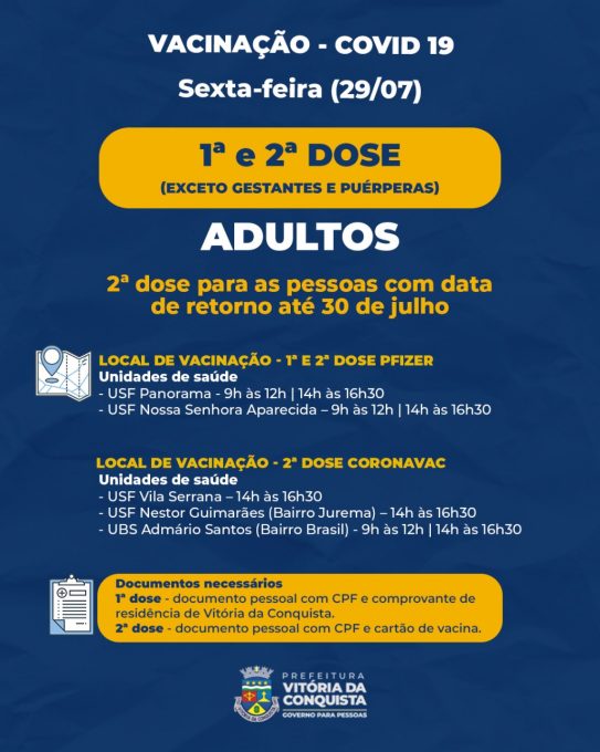 A 1ª dose ou 2ª dose da Pfizer estará disponível para os adultos nas unidades Panorama e Nossa Senhora Aparecida. Para quem precisa tomar a 2ª dose da Coronavac, a vacinação será nas unidades Admário Santos (bairro Brasil) e Vila Serrana; e Nestor Guimarães (Jurema) das 14h às 16h30.