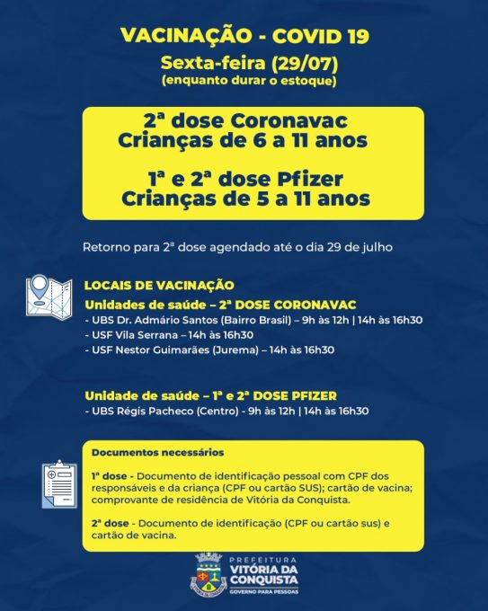 Para o público de 5 a 11 anos, terá a 1ª e 2ª dose da Pfizer na unidade Régis Pacheco (Centro). Já as crianças de 6 a 11 que precisam da 2ª dose da Coronavac, podem ser vacinadas na unidade de saúde Admário Santos (bairro Brasil), nos dois turnos, e nas unidades Nestor Guimarães (Bairro Jurema) e Vila Serrana, à tarde.