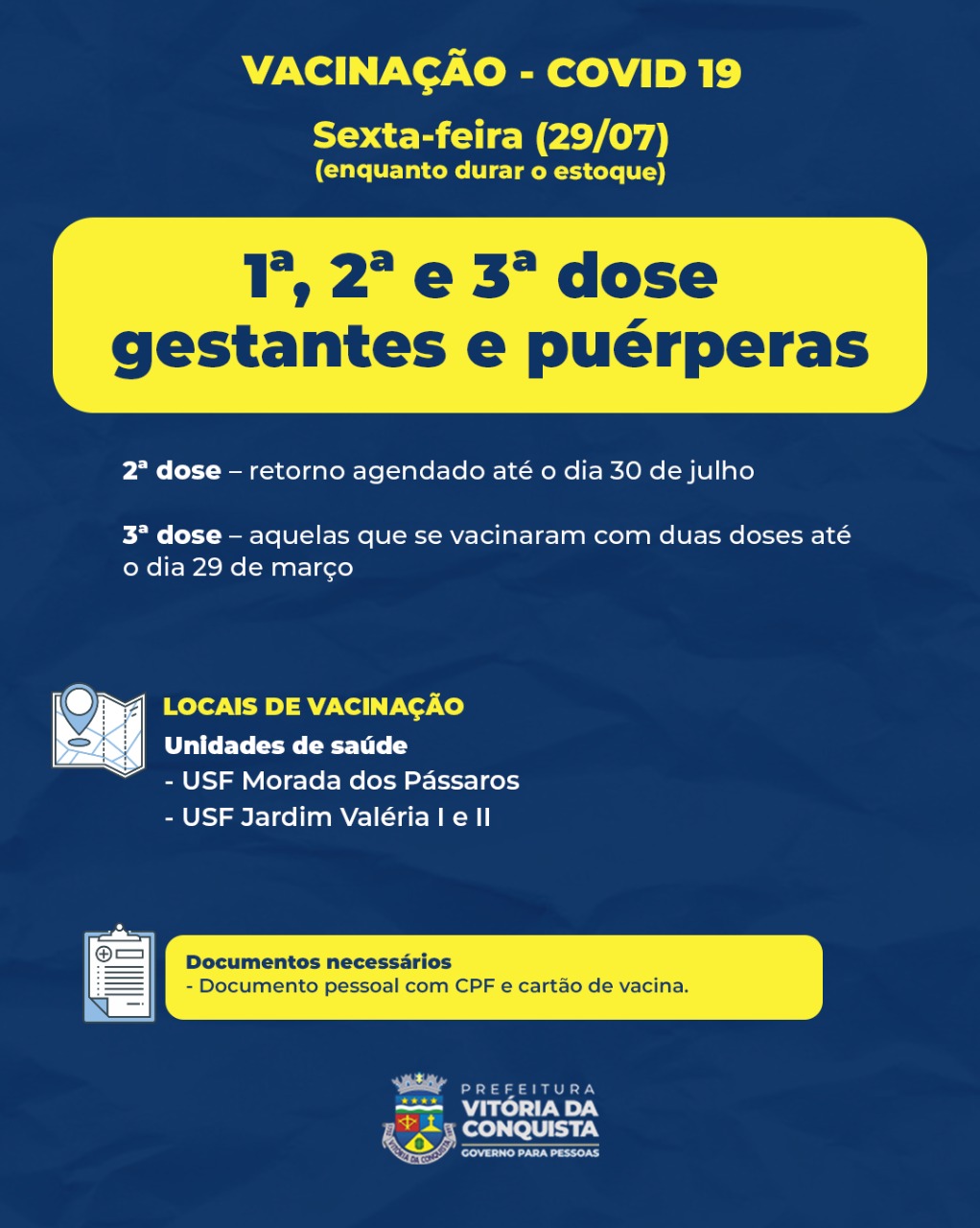 Adolescentes, gestantes e puérperas – Para esses grupos, terá a 1ª, 2ª e 3ª doses nas unidades de saúde Morada dos Pássaros e Jardim Valéria I e II, nos dois turnos. Os adolescentes devem estar acompanhados dos pais ou responsáveis no momento da vacinação.