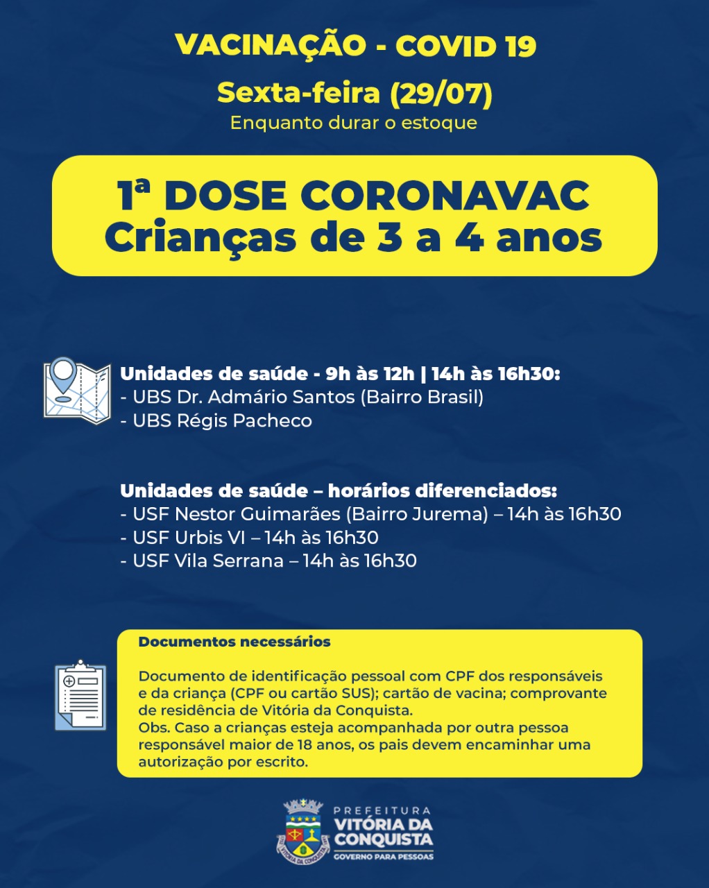 Crianças – A 1ª dose da Coronavac para as crianças de 3 e 4 anos, estará disponível, nos dois turnos, nas unidades de saúde Dr. Admário Santos (bairro Brasil) e Régis Pacheco. No turno da tarde, terá vacinação para esse público nas unidades Vila Serrana, Nestor Guimarães (bairro Jurema) e Urbis VI.