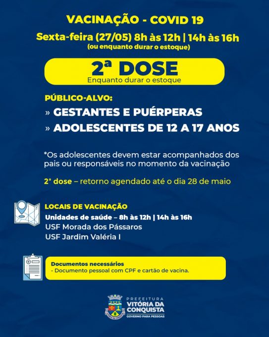 Adolescentes, gestantes e puérperas – Nas unidades de saúde Morada dos Pássaros e Jardim Valéria I, nos dois turnos, terá a 2ª dose para esses três grupos, com retorno agendado para o dia 28 de maio ou datas em atraso. Os pais ou responsáveis devem acompanhar os adolescentes durante a vacinação.