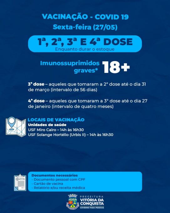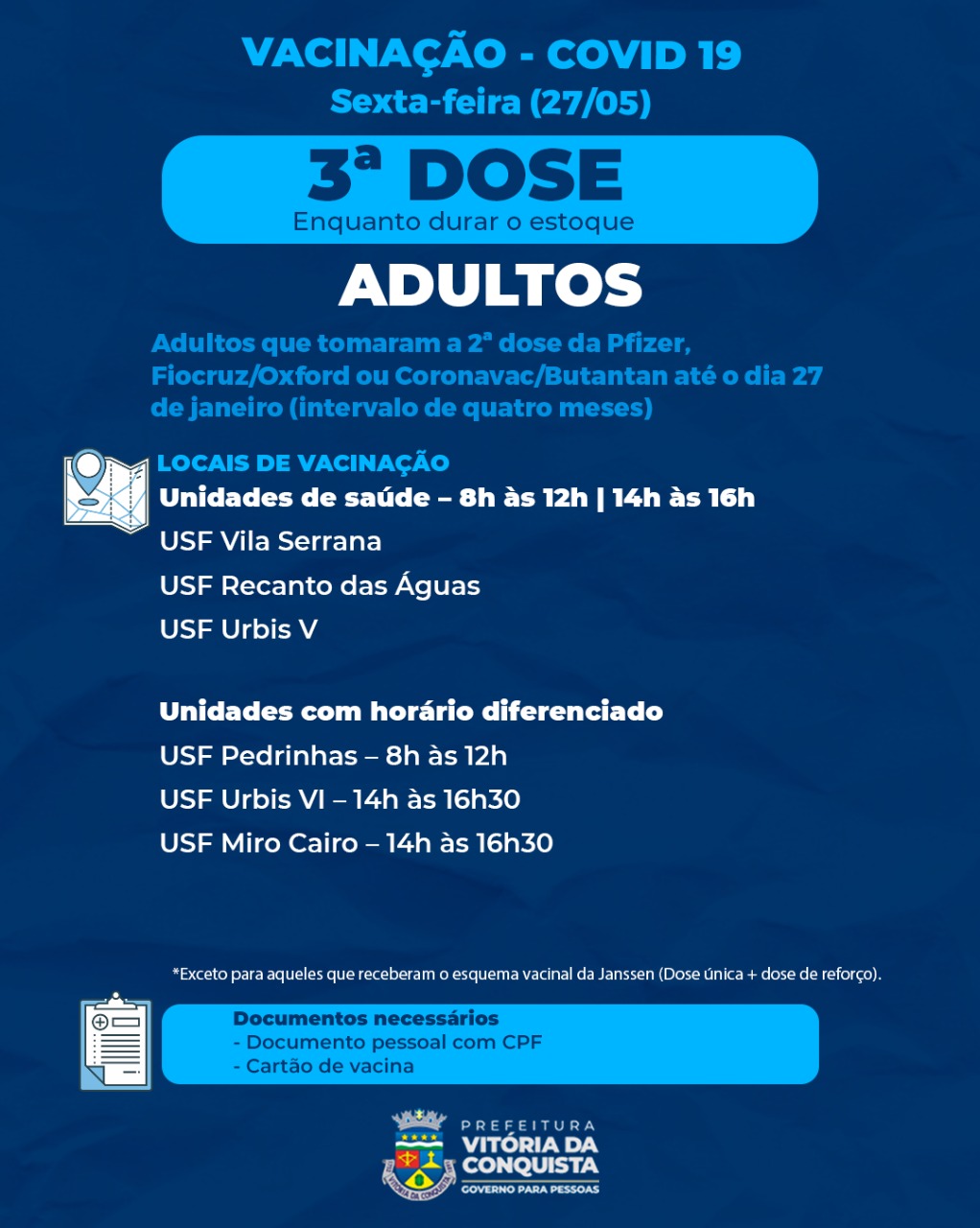 Adultos – Aqueles que tomaram as duas doses da vacina até o dia 27 de janeiro, já devem tomar a 3ª dose nas unidades de saúde Vila Serrana, Recanto das Águas e Urbis V, nos dois turnos; na unidade Pedrinhas somente pela manhã, das 8h às 12h; e nas unidades Miro Cairo e Urbis VI, das 14h às 16h30.
