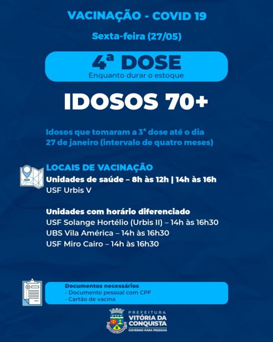 Idosos e imunossuprimidos – A 4ª dose estará disponível apenas para os idosos de 70 anos ou mais e imunossuprimidos maiores de 18 anos, que tomaram as três doses anteriores até o dia 27 de janeiro (intervalo de quatro meses). Os imunossuprimidos que tomaram duas doses até o dia 31 de março (intervalo de 56 dias) podem tomar a 3ª dose.