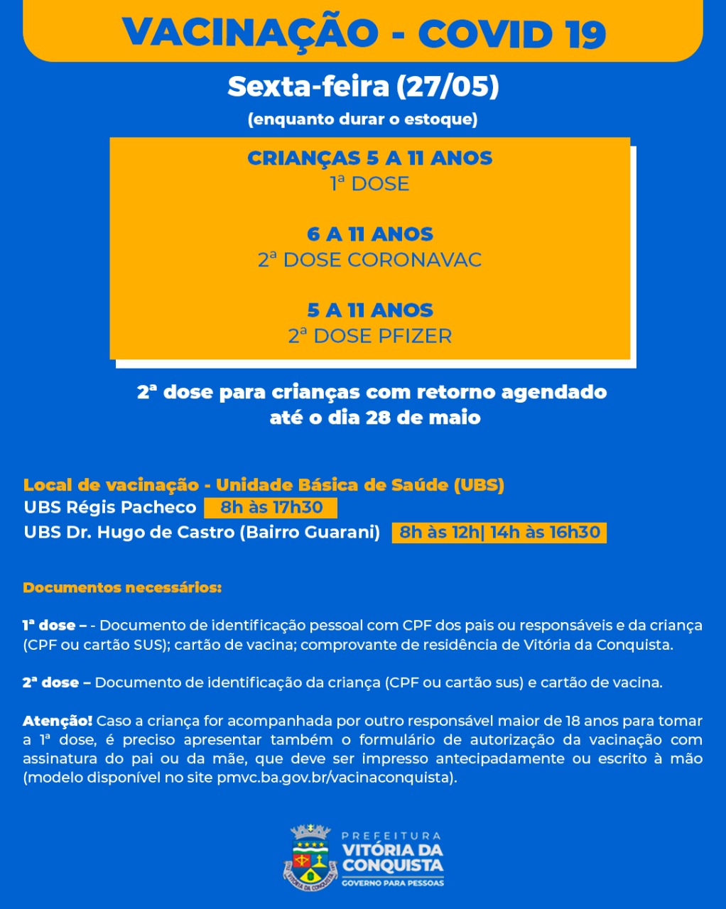 Público infantil – As crianças de 5 a 11 anos poderão ser vacinadas com a 1ª dose ou 2ª dose, com retorno agendado até o dia 28 de maio, da Pfizer e da Coronavac, na Unidade de Saúde Régis Pacheco, das 8h às 17h30 (sem intervalo para almoço), ou na Unidade de Saúde Dr. Hugo de Castro (bairro Guarani), das 8h às 12h e das 14h às 16h30.