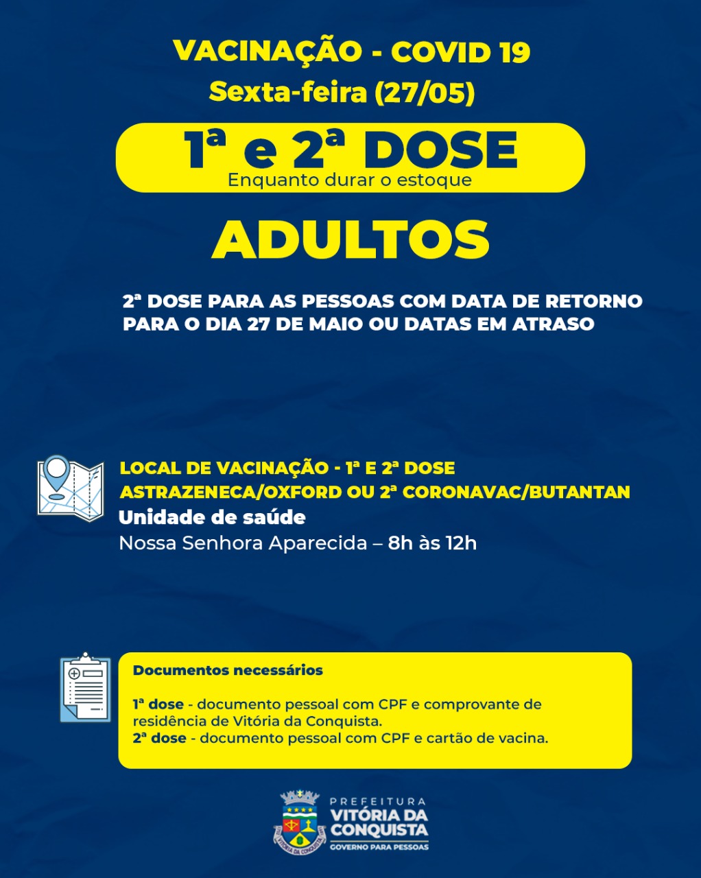 Para quem precisa tomar a dose adicional de reforço da Janssen, a vacina está disponível na USF Solange Hortélio, das 14h às 16h30. Já para o adulto que não se vacinou com a 1ª dose ou precisa da 2ª dose da AstraZeneca/Fiocruz ou Coronavac/Butantan, com retorno agendado até o dia 27 de maio, a vacinação será na unidade Nossa Senhora Aparecida, somente no turno matutino.