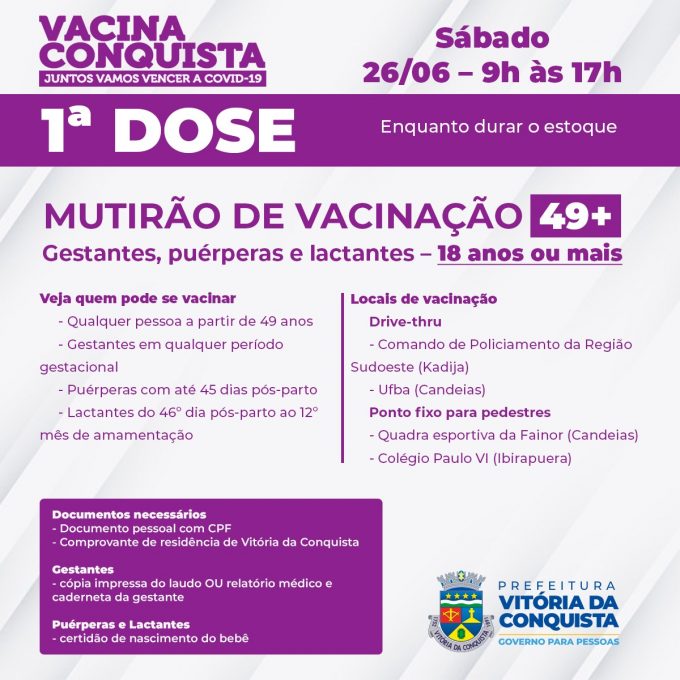 A vacinação será oferecida para qualquer cidadão residente em Vitória da Conquista, com 49 anos ou mais, além de gestantes, puérperas e lactantes – com 18 anos ou mais e acontece nos pontos fixos: quadra esportiva da Fainor (Candeias) e Colégio Paulo VI (Ibirapuera), ou nos drive-thrus na UFBA (Candeias) e no Comando de Policiamento da Região Sudoeste (CPRSO) – Kadija.
