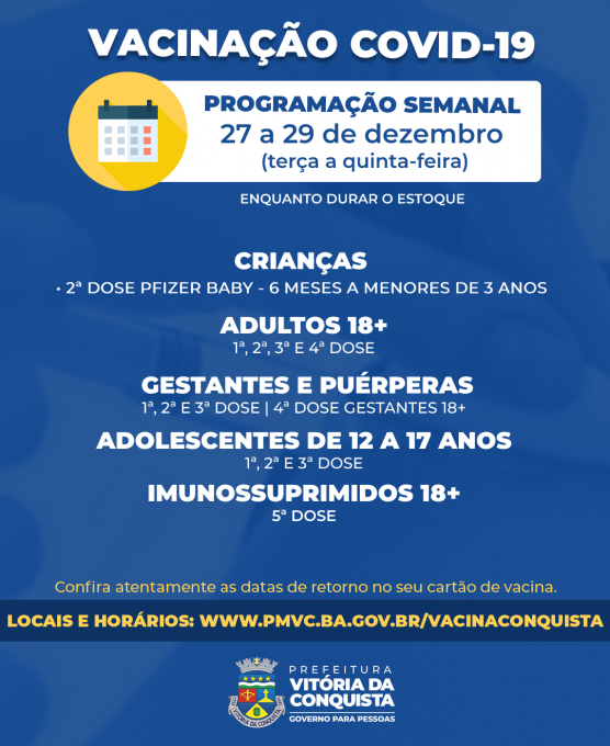Desta terça (27) até a próxima quinta-feira (29), a vacinação contra a Covid-19 continua nas unidades de saúde, com exceção da sexta-feira (30), que não haverá expediente nas unidades devido ao ponto facultativo, conforme Decreto Municipal nº 22.321.