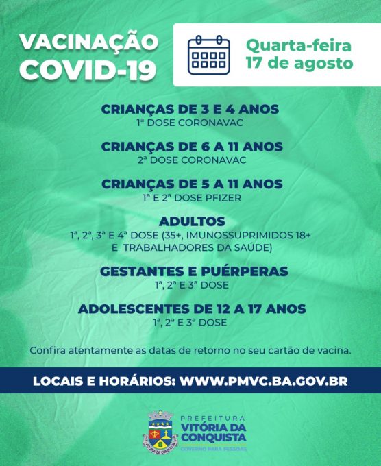 Antes de se dirigir ao local de vacinação, confira atentamente a data de retorno no cartão de vacina. A 2ª dose está disponível para todas as pessoas com retorno agendado até o dia 18 de agosto; a 3ª dose para quem tomou as duas doses anteriores até o dia 17 abril; e a 4ª dose com o intervalo de quatro meses da 3ª dose.