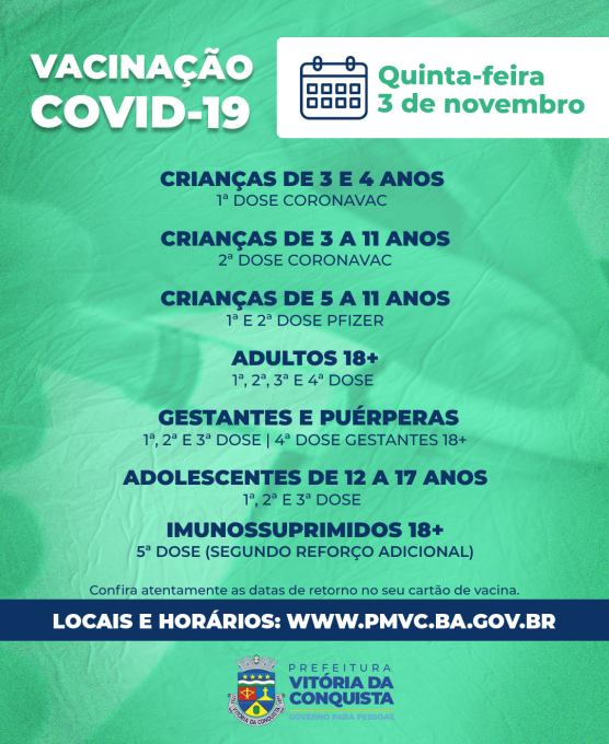 Documentação: Para a 1ª dose, é preciso apresentar o documento de identificação pessoal com CPF dos responsáveis e da criança (CPF ou cartão SUS); cartão de vacina; comprovante de residência de Vitória da Conquista. Caso a criança esteja acompanhada por outro responsável maior de 18 anos, os pais devem encaminhar autorização para vacinação por escrito.