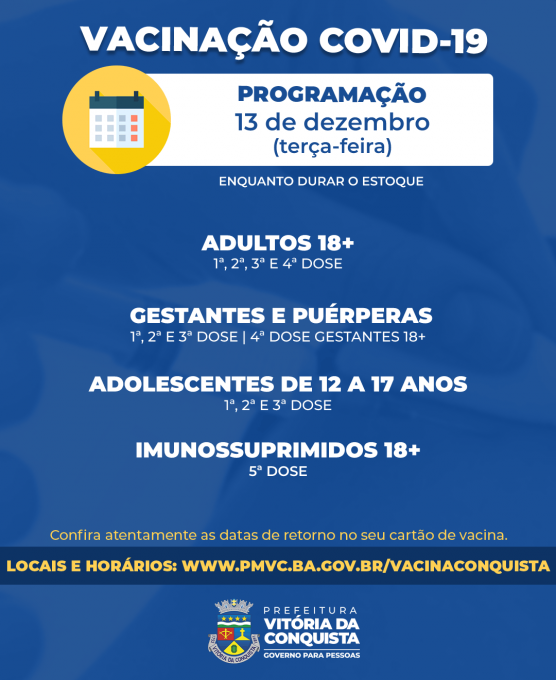 Continua nesta terça-feira (13), a vacinação contra a Covid-19 nas unidades de saúde, exceto para as crianças de seis meses a 11 anos, pois o estoque de vacinas do município destinado a esse público chegou ao fim. A Secretaria Municipal de Saúde (SMS) está aguardando o envio de mais 0vacinas pela Secretaria de Saúde do Estado da Bahia (Sesab), mas ainda não há previsão para a chegada dos imunizantes.