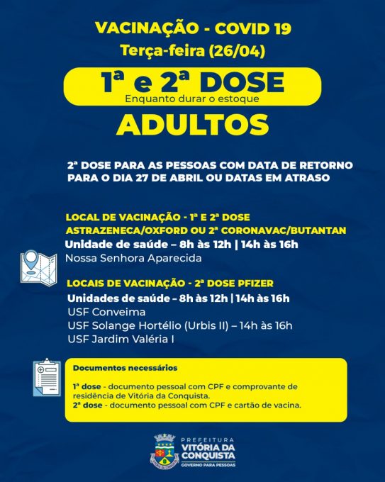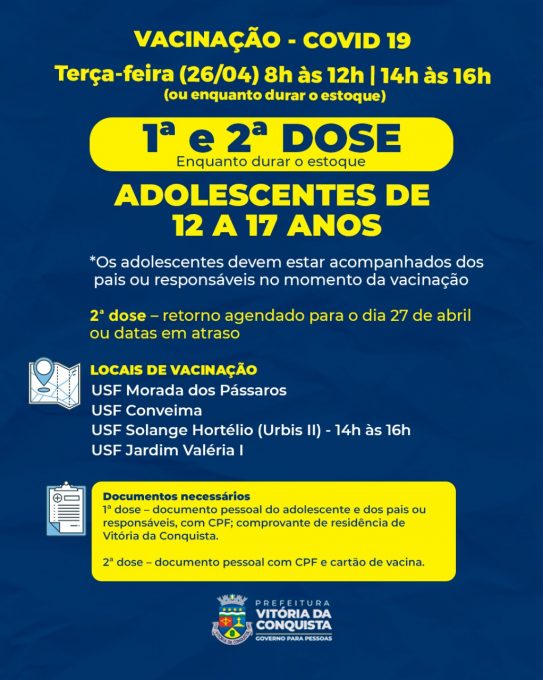 Para os adolescentes, terá a 1ª dose ou a 2ª dose para aqueles com retorno marcado até o dia 27 de abril. Os pais ou responsáveis devem acompanhá-los durante a vacinação nas unidades Conveima, Morada dos Pássaros e Jardim Valéria I, e na unidade Solange Hortélio apenas no período da tarde.