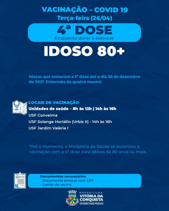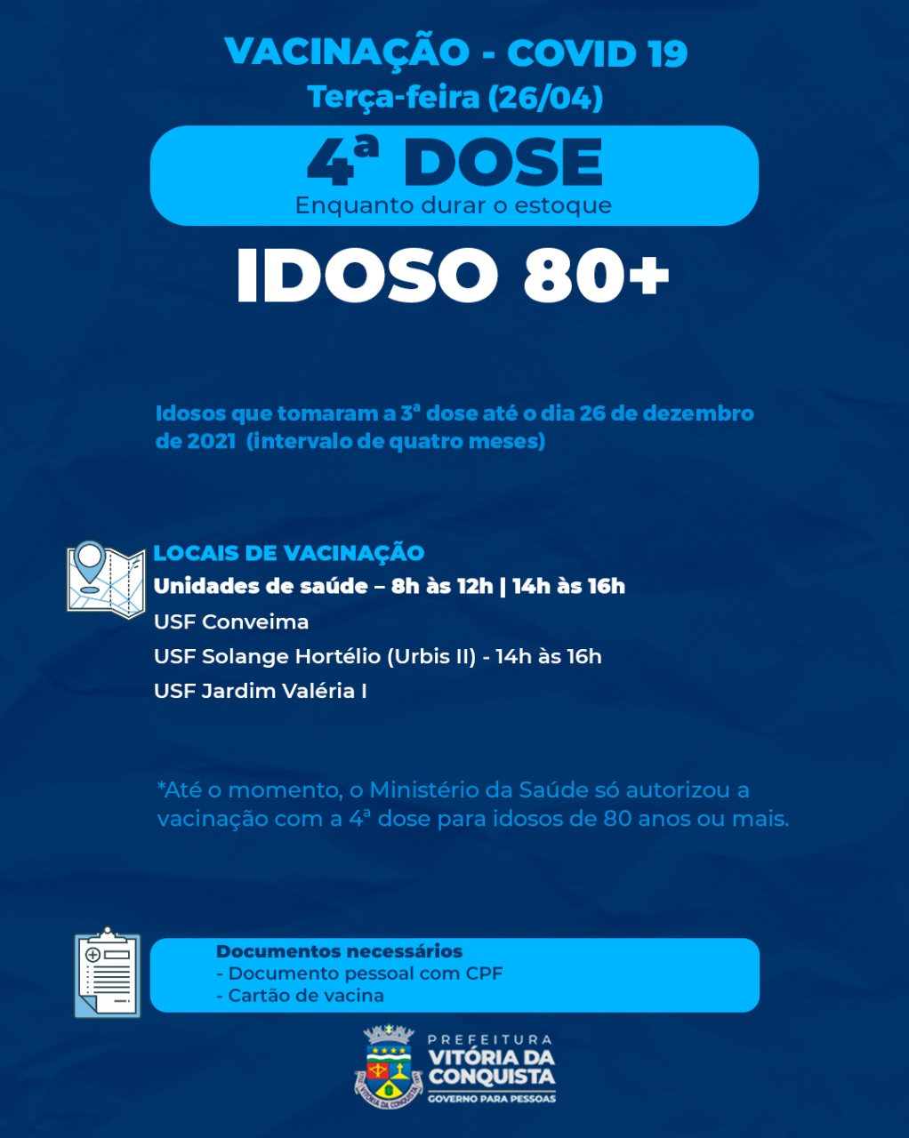Nessas unidades que farão a vacinação dos imunocomprometidos, terá também a 4ª dose para os idosos de 80 anos ou mais que tomaram as três doses anteriores até o dia 26 de dezembro de 2021, com exceção da USF Morada dos Pássaros.