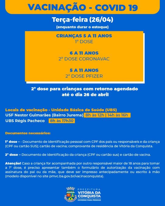 Crianças e adolescentes – Terá a 1ª dose e 2ª dose da Pfizer para as crianças de 5 a 11 anos, e a 2ª dose da Coronavac, de 6 a 11 anos, com retorno marcado até o dia 26 de abril, na unidade Nestor Guimarães (Bairro Jurema), de 8h às 12h e de 14h às 16h; e na UBS Régis Pacheco (Centro), de 8h às 17h30, sem intervalo para o almoço.