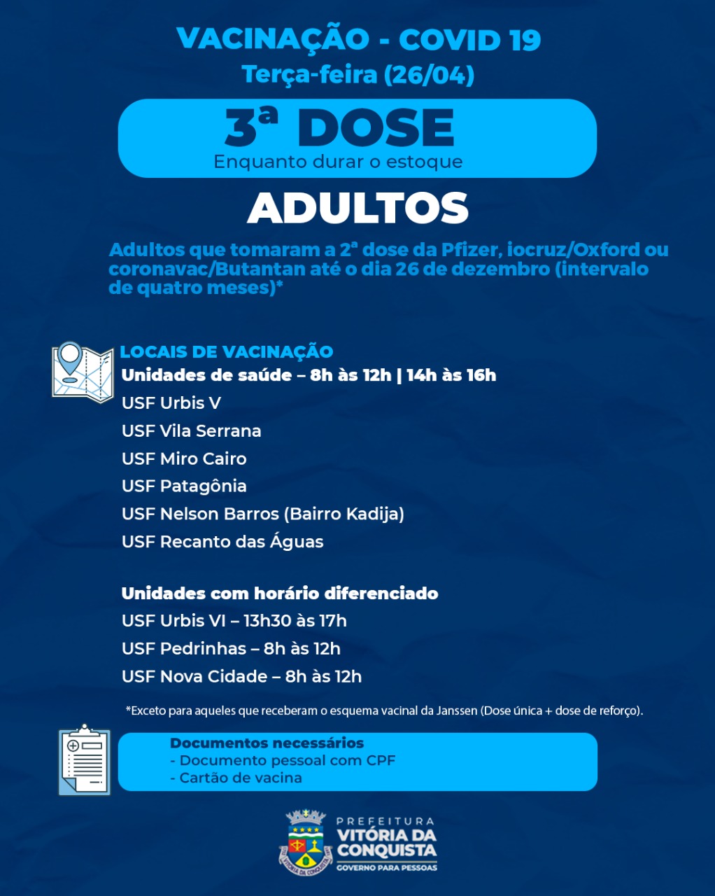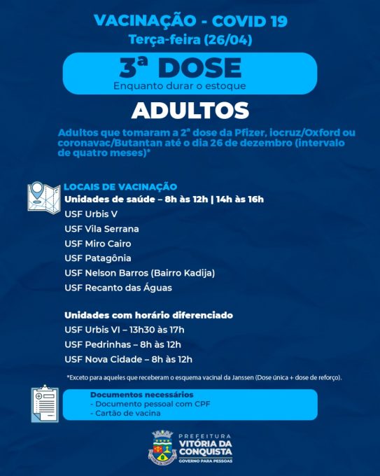 Adultos – Para quem tomou a 2ª dose até o dia 26 de dezembro de 2021, a 3ª dose estará disponível nas unidades de saúde Urbis V, Vila Serrana, Miro Cairo, Patagônia, Nelson Barros (Bairro Kadija) e Recanto das Águas. Nas unidades Pedrinhas e Nova Cidade, a vacinação ocorre apenas no turno da manhã; e na unidade Urbis VI, a vacinação é de 13h30 às 17h.