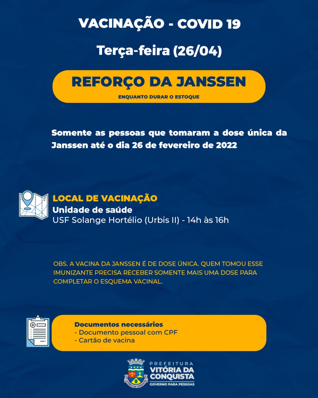Exclusivamente na unidade Nossa Senhora Aparecida, terá a 1ª dose para os adultos não vacinados e a 2ª dose da AstraZeneca/Fiocruz ou Coronavac/Butantan, para aqueles com retorno agendado até o dia 27 de abril. Já a 2ª dose da Pfizer está disponível nas unidades Conveima e Jardim Valéria I, nos dois turnos, e na unidade Solange Hortélio (Urbis II) no turno vespertino. Para aqueles que tomaram a dose única da Janssen até o dia 26 de fevereiro, a dose de reforço pode ser encontrada somente na USF Solange Hortélio, de 14h às 16h.