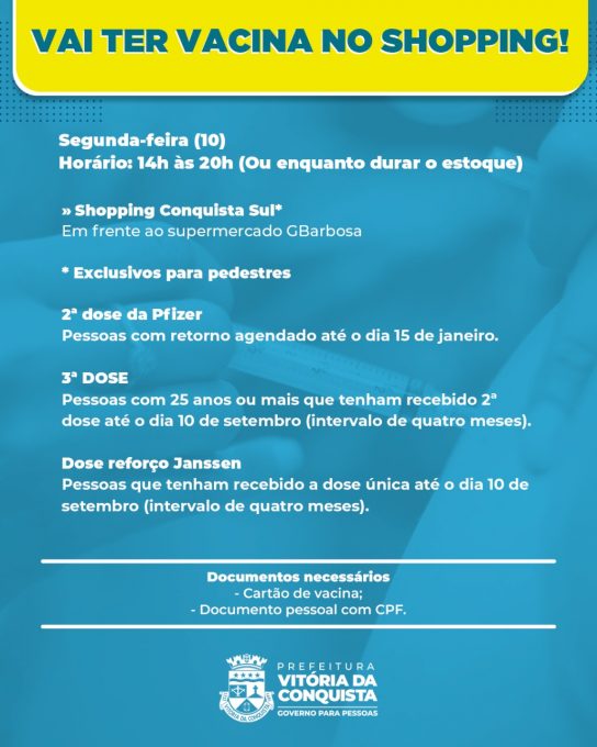 A vacinação contra a Covid-19 será retomada nesta segunda-feira (10) no Shopping Conquista Sul, das 14h às 20h, e nas unidades de saúde, de 8h às 12h e de 14h às 16h, ou enquanto durar o estoque de doses. Confira os públicos: