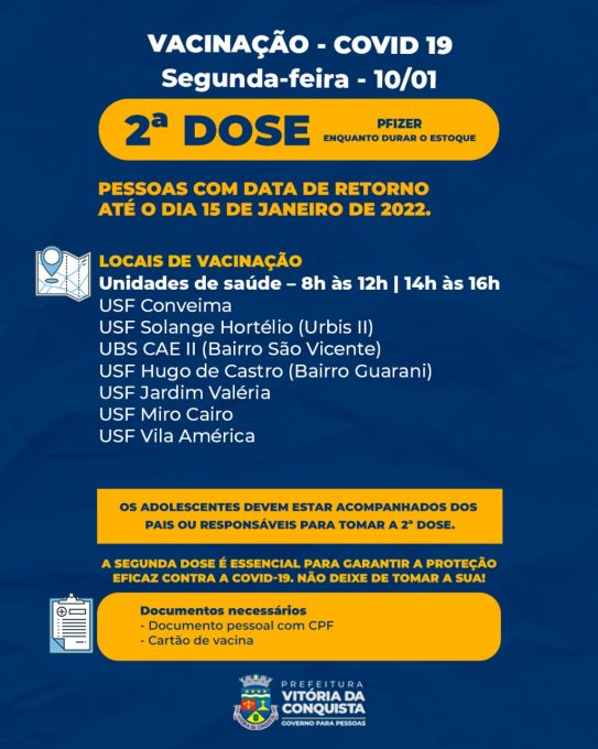Já para as pessoas que precisam tomar a 2ª dose da Pfizer até o dia 15 de janeiro, pode antecipar a vacinação nas unidades de saúde do Conveima, Solange Hortélio (Urbis II), CAE II (Bairro São Vicente), Hugo de Castro (Bairro Guarani), Jardim Valéria, Miro Cairo ou Vila América.